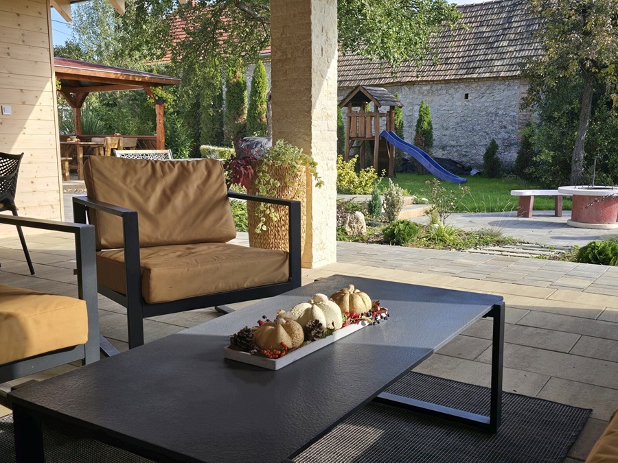 A füves, pihenőkkel kialakított kert, kiváló helyszíne a kirándulások utáni pihenéseknek, a családi játékoknak biztonságos, szabad környezetben.